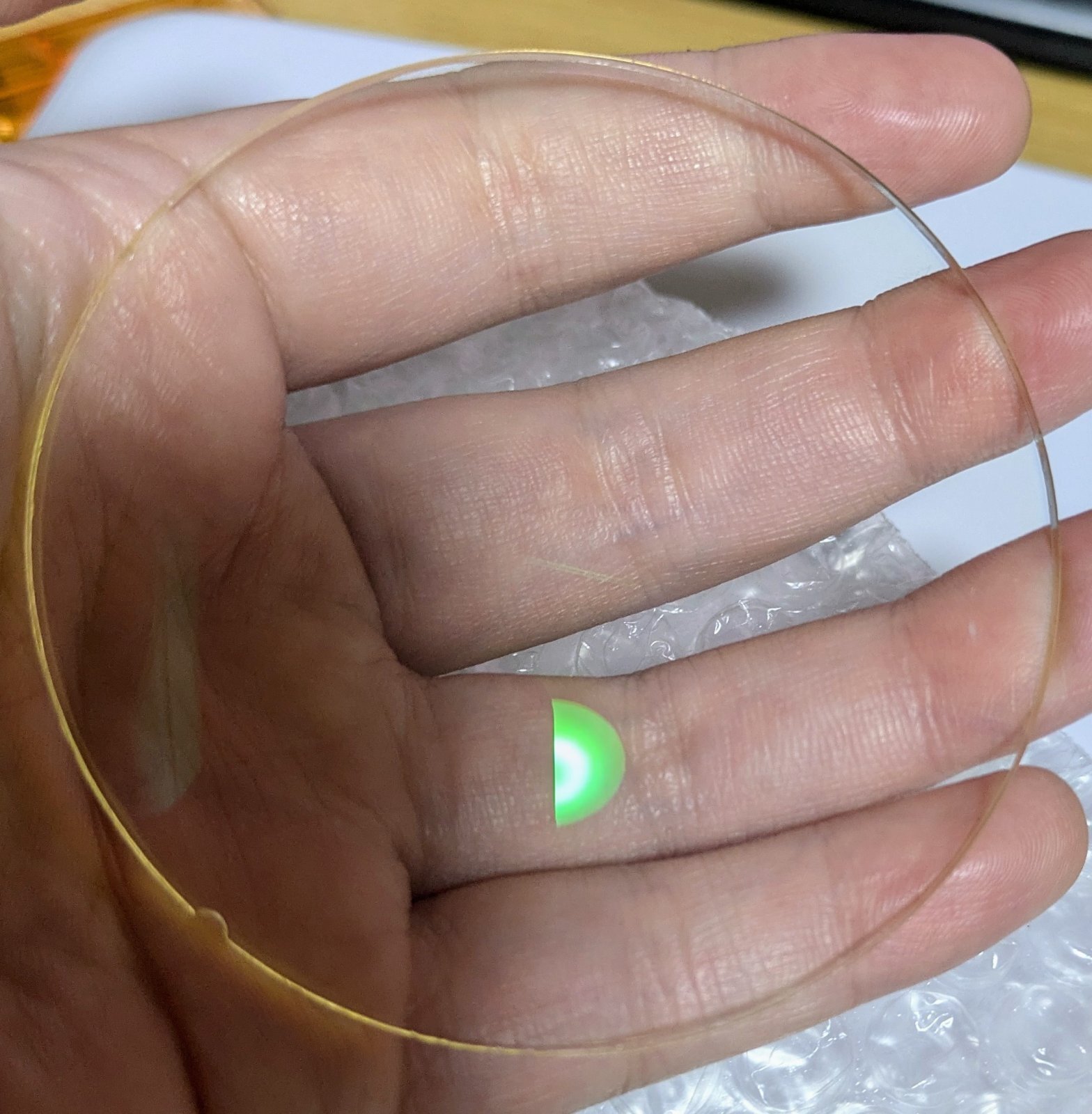 ちょっと欠けた部分とレンズの外側が黄色く見えます。アクリルなので経年劣化してしまうようです。
